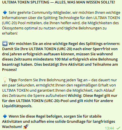 Dazu fand ich diese Aussage von Kevin: „Der Ultima Token kann nach dem Auftauen frei versendet werden, um ihn an der Börse zu verkaufen muss er über Ultima.io in den Coin getauscht werden. Da gibt es wie Patrick sagt ein Tageslimit welches den Verkaufsdruck verteilt.“ Ultima.io wird dann also wohl das Nadelöhr werden.